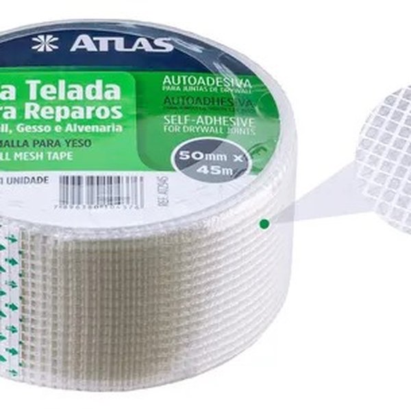 A solução ideal para quem busca acabamentos perfeitos em paredes e tetos! A fita telada adesiva Atlas 45m x 50mm é autoadesiva, fácil de aplicar e indispensável para reforçar emendas no drywall e reparar trincas no gesso.
